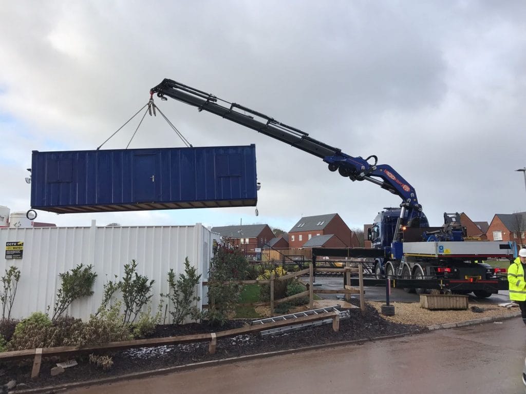 Driver deserved a gold medal for his skill and professionalism in using the hiab on this unusual short body artic unit to position a siteoffice.www.gerrywebbtransport.co.uk