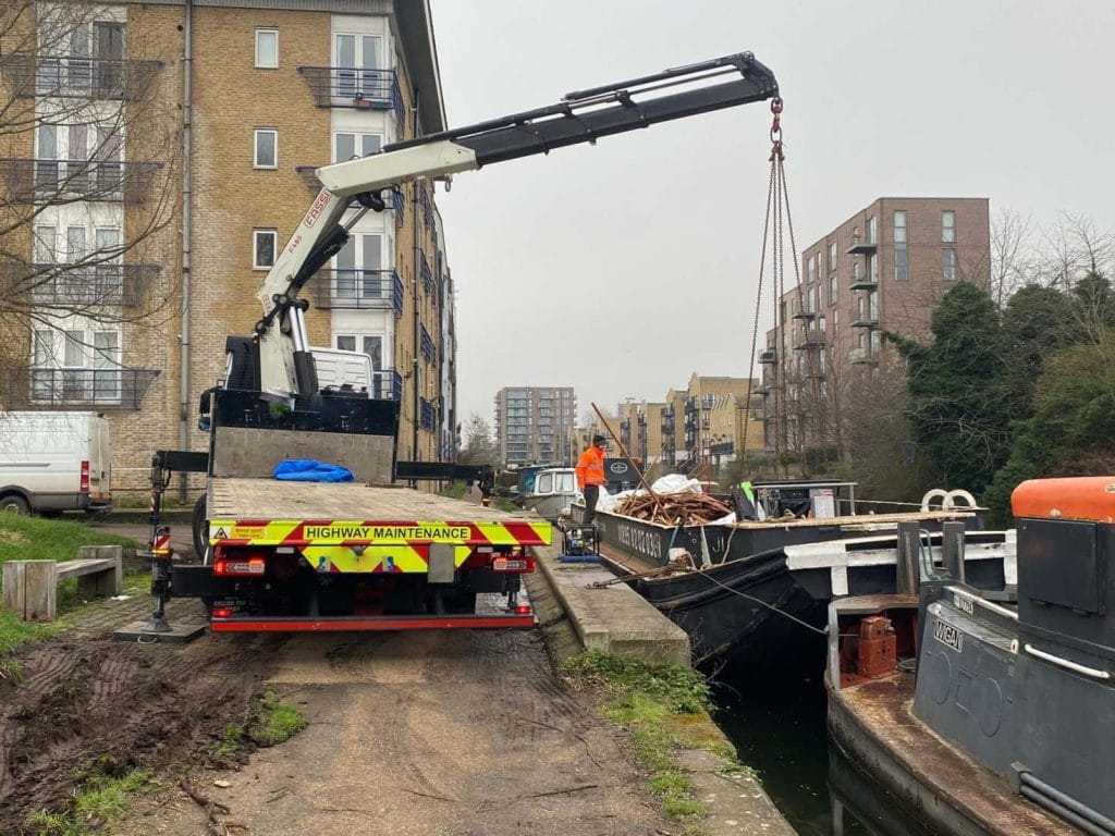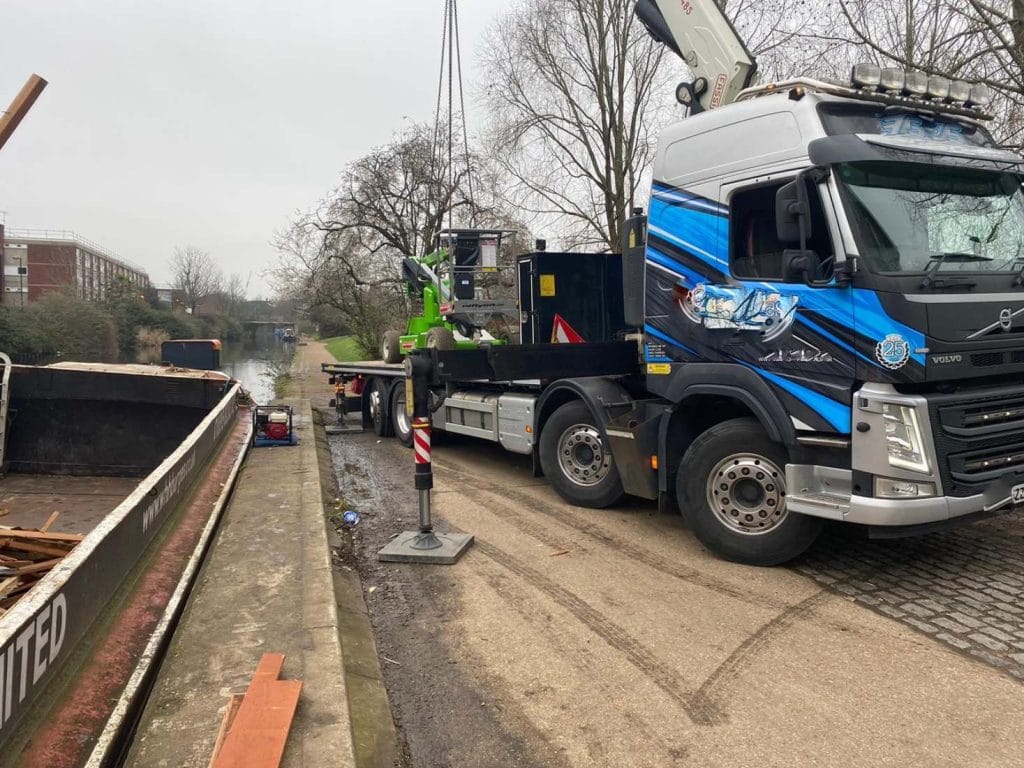 Long gone are the days of transporting goods on canals, but this job floated our boat when this cherrypicker needed to be placed by hiab onto a barge in order to aid workman on the waterway. Grab #lorries previously emptied some of the cladding to make way for our delivery.